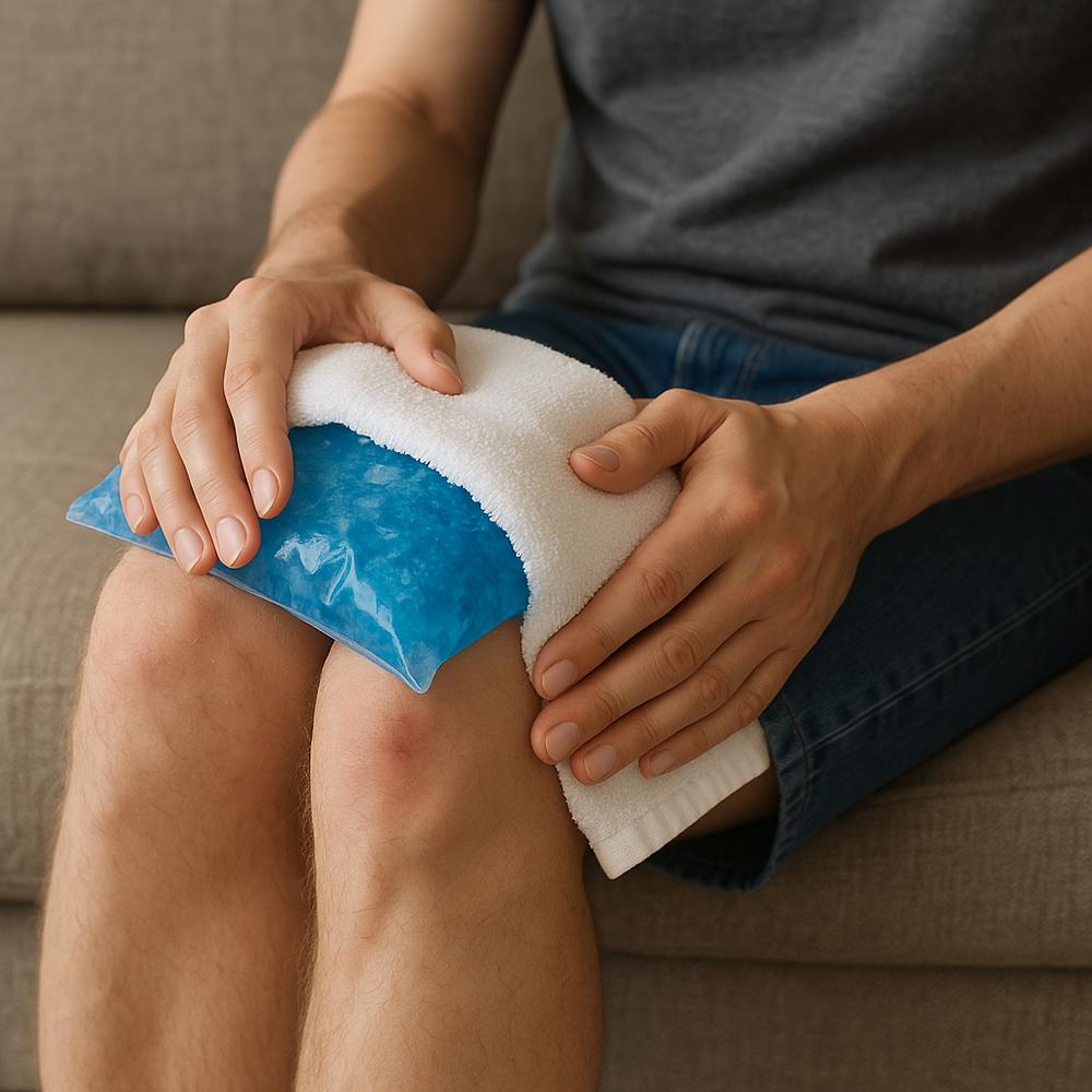 – Pacotes de gel reutilizáveis: moldam-se bem a joelhos, ombros e tornozelos; mantenha-os no congelador e use com tecido protetor.