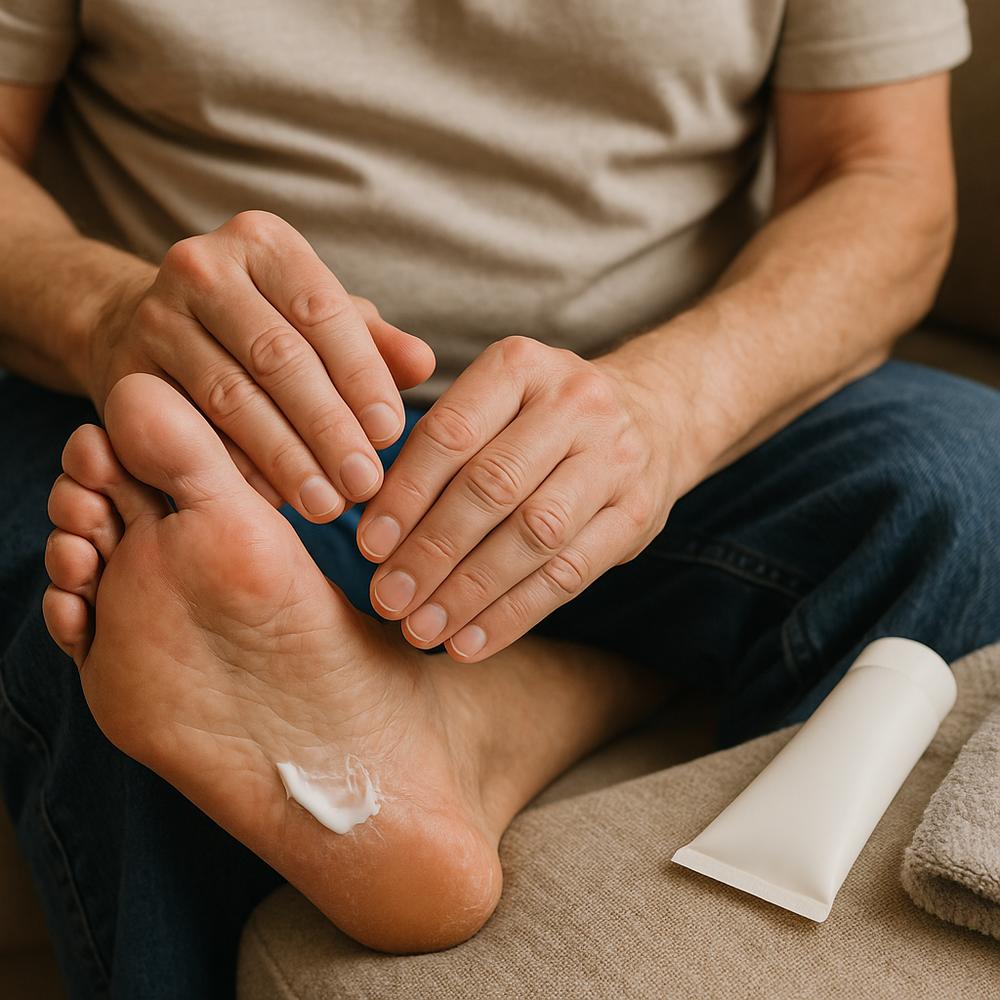 – Hidratante não oleoso para pés (sem ureia em áreas fissuradas abertas).