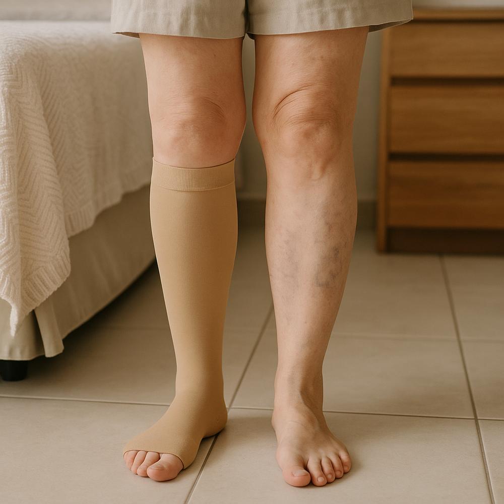 – 3/4 (até abaixo do joelho): suficiente para a maioria das varizes de panturrilha e edema maleolar. É a opção mais confortável no calor.
