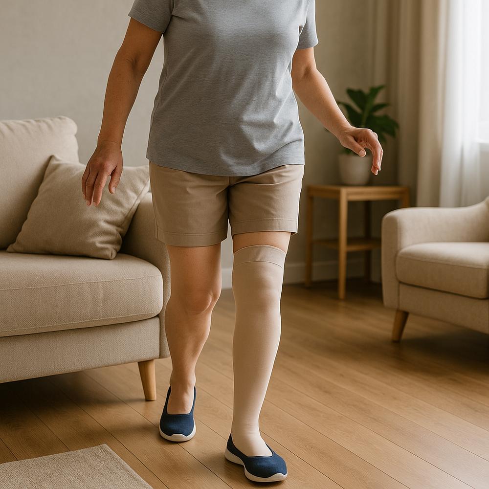– Terapia compressiva: meias 20–30 mmHg (ou conforme prescrição) e peças específicas para quadril/coxa.