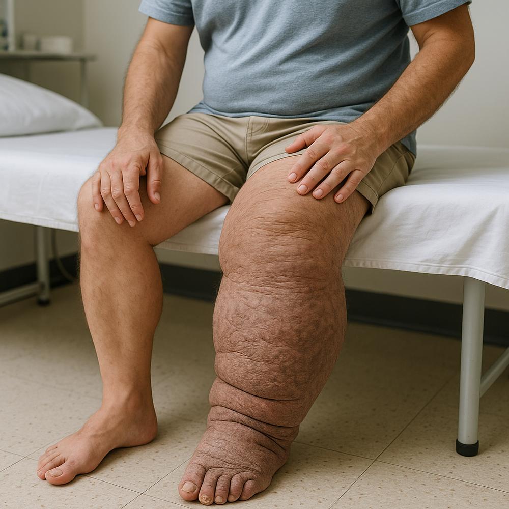 – Circunferências desproporcionais (panturrilha e coxa maiores em relação ao tronco), com pele que pode apresentar aspecto nodular.