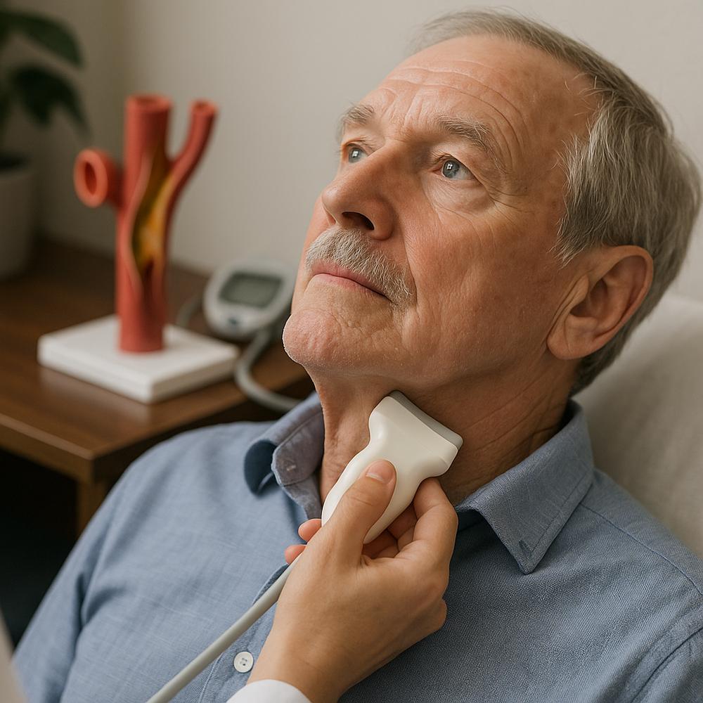 O Doppler de carótidas é um exame indolor, sem radiação, que mede o grau de estenose e a velocidade do fluxo. Não é um exame de rastreio universal para toda a população, mas é valioso em perfis de maior risco: