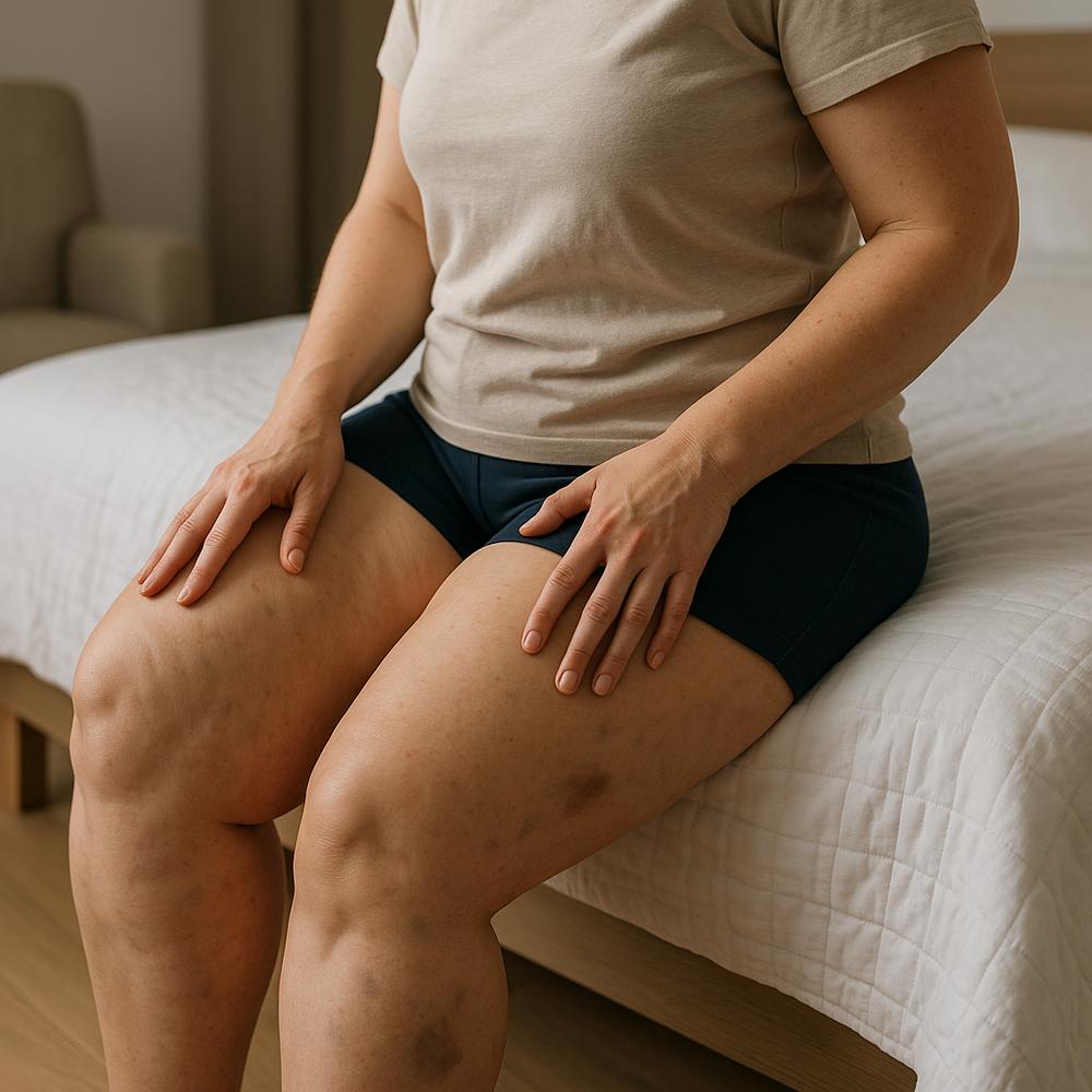 – Palpe nódulos: deslize os dedos nas áreas mais doloridas (lateral das coxas, parte interna dos joelhos, panturrilhas). Descreva textura e sensibilidade.