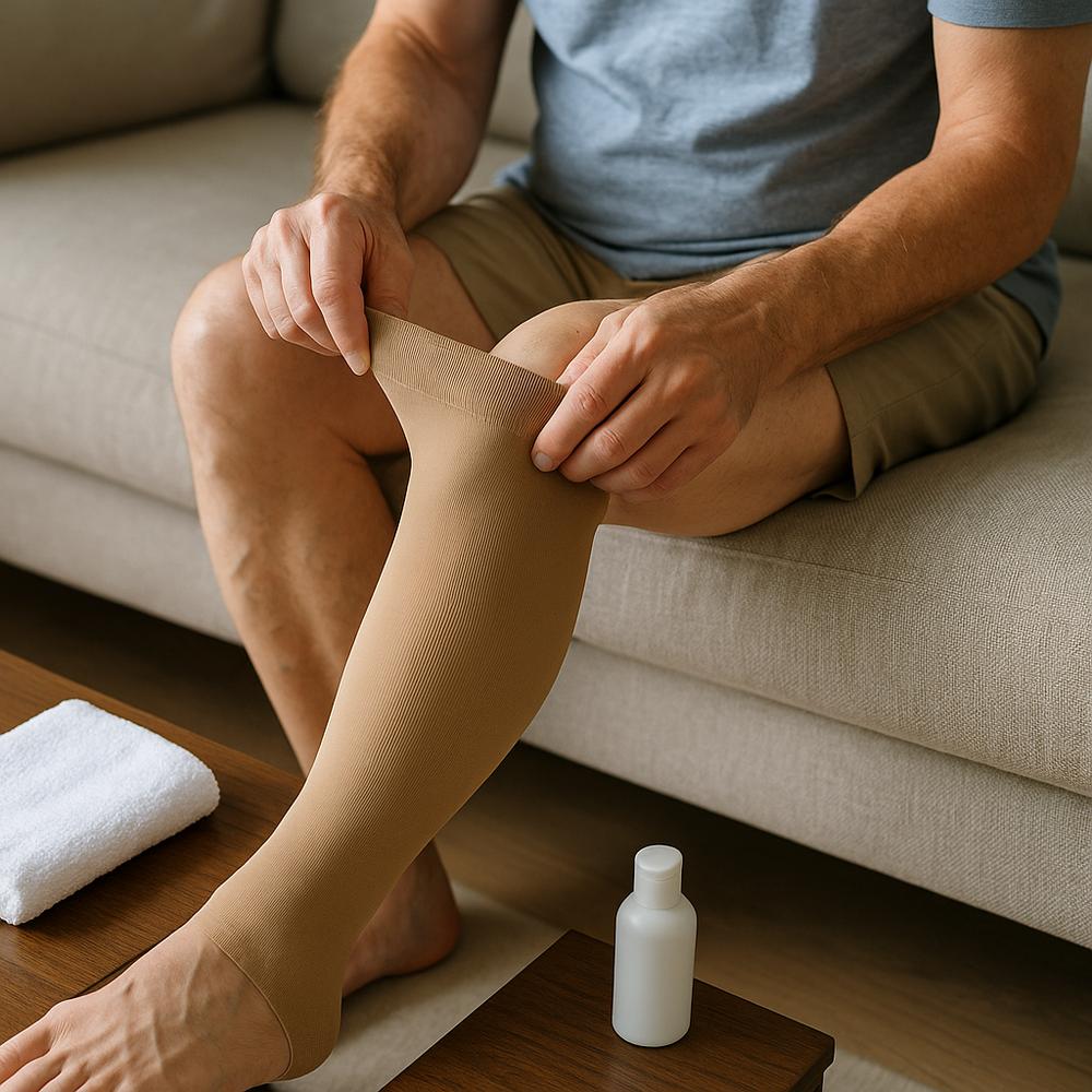 – Associe medidas consagradas: meia de compressão (prescrita), hidratação, caminhada